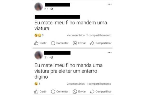 “Eu matei meu filho, mandem uma viatura para ele ter um enterro digno”, falou na postagem. Além da confissão, a mulher também postou o endereço dela.