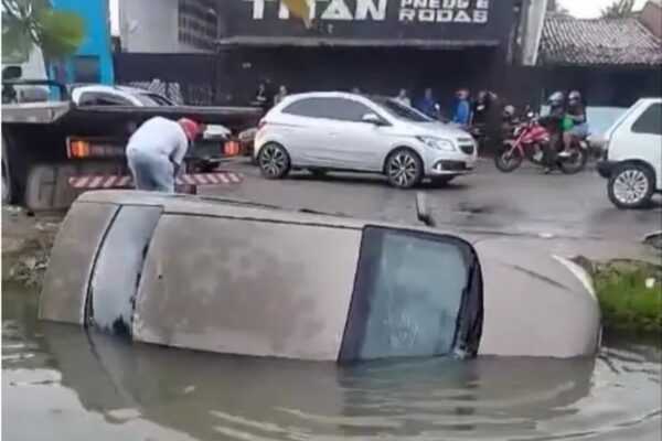 Imagens de câmeras de videomonitoramento registraram o momento em que um carro caiu dentro de um córrego no bairro Levada, em Maceió, na manhã deste sábado (22/6).